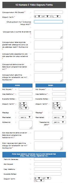 Aşağıda örneği verilmiş başvuru formuna Fox Tv’nin resmi internet sayfasındaki 10 Numara 5 Yıldız yarışması sayfası üzerinden ulaşabilirsiniz. Formu doldurduktan sonra Başvuruyu Tamamla butonuna basmayı unutmayınız.