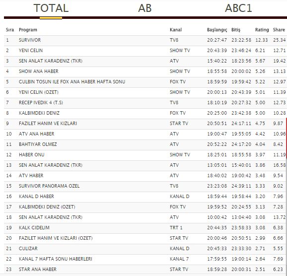 Ve tüm bunların yanı sıra uzun süredir beklenen fenomen yarışma programı Survivor 10 Şubat 2018 Cumartesi reyting sonuçlarını nasıl etkileyecek? 12 yıldır yayınlandığı dönemlerde zirveyi kimseye kaptırmayan survivor aynı başarısını 13. sezonda korumayı başaracak mı? Survivor’ın reytingleri allak bullak edeceğini düşünüyoruz.