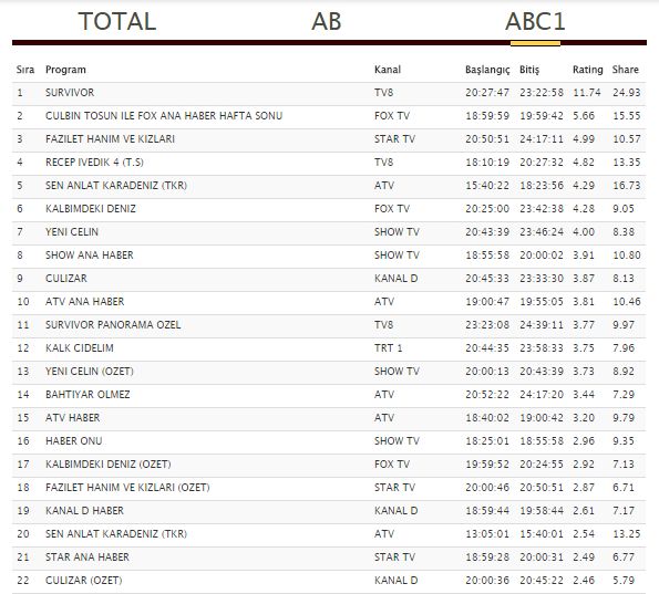 10 Şubat 2018 Cumartesi reyting oranları açıklanır açıklanmaz haberimizde güncellenecektir. Siz hayranı olduğunuz keyifle izlediğiniz diziler hakkındaki görüşlerinizi yorum kısmında paylaşabilirsiniz? Survivor aynı gün aynı anda yayınlanan diğer dizileri nasıl etkiler? Yorumlarınızı bekliyoruz.