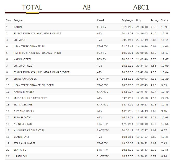 | 4 | FATIH PORTAKAL ILE FOX ANA HABER | 06-02-2018 | 6.68 | 19.88 |