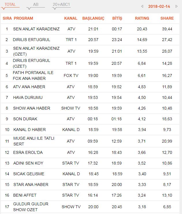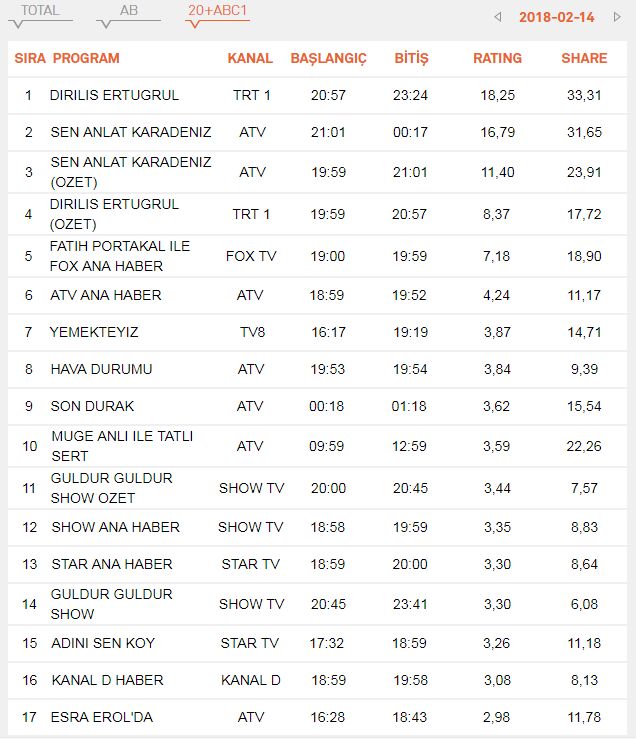 | 4 | DIRILIS ERTUGRUL (OZET) | 14-02-2018 | 19:45:55 | 6.63 | 14.39 |