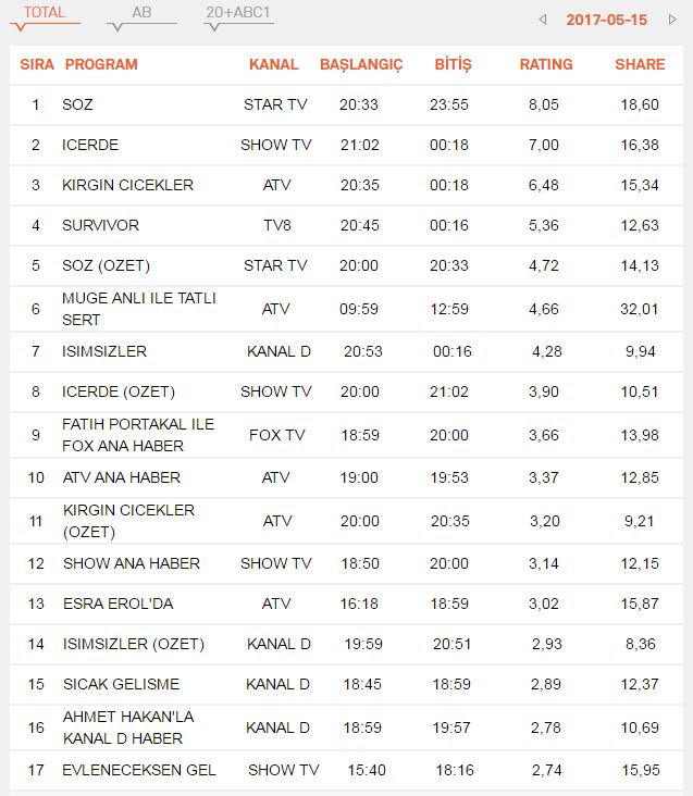 Kırgın Çiçekler son bölümüne göre daha iyi izleyici çekti. Son demlerinde 7lere sıkça vurdu. İçerde son bölümüne göre yeni izleyici çekmede güçlük yaşadı. Reytinglerde 3. olursa size şaşkınlık vermesin. Survivor son bölümüne göre daha düşük izleyici çekti. İsimsizler öyle düzensiz izleyici gönderip çektiki analiz için hiç bir veri yok. Resmi veriler geldiğinde sitemizde paylaşılacaktır. Ve sonuçlar belli oldu, işte 15 mayıs reyting sonuçları.