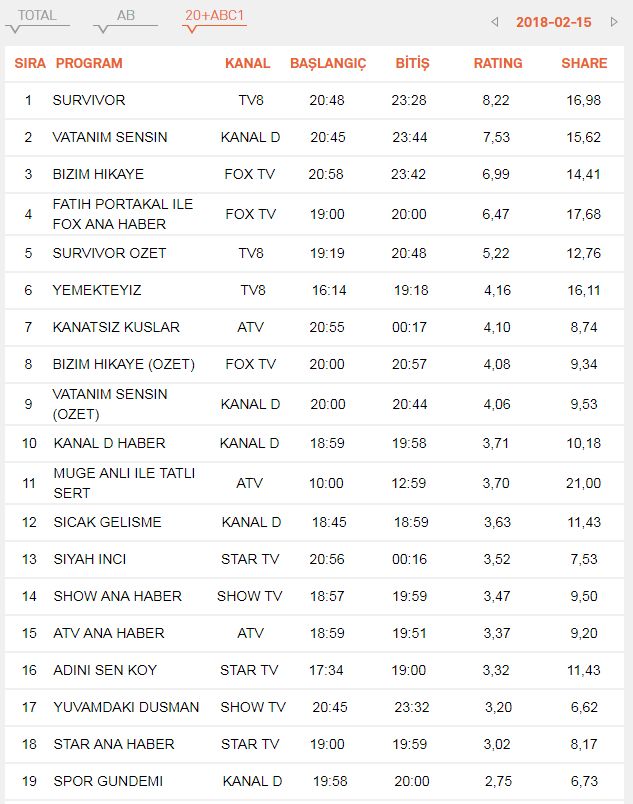 Bu durumda ciddi anlamda sonucu etkileyebilecek 4 dizi karşımıza çıkıyor. Bizim hikaye, Vatanım Sensin, Kanatsız Kuşlar ve Mehmetçik Kutül Amare. Buy dizilerden ise Bizim Hikaye ve Vatanım Sensin’in ağırlığı reyting sonuçlarında hissediliyor. MEhmetçik yayınlandığı günlerde iddialı bir reyting oranı yakaladı ama bunu çok fazla sürdüremedi. Ancak yinede potansiyeli olan bir yapım. Reytinglerde ilk 3 arasında yerini aldı.
