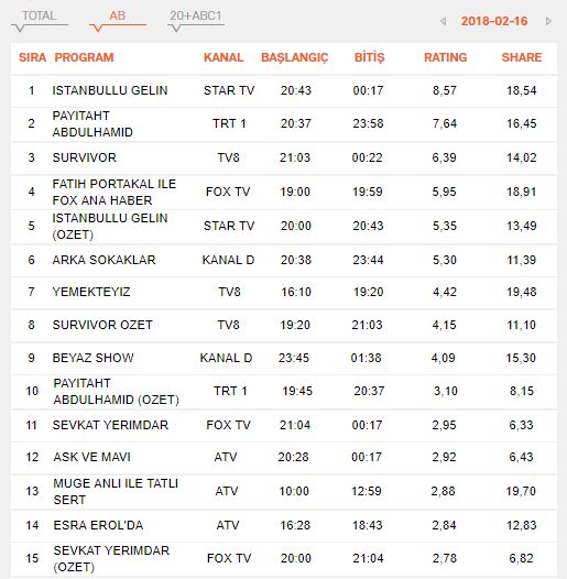 | 9 | ISTANBULLU GELIN (OZET) | STAR TV | 09-02-2018 | 4.26 | 9.65 |