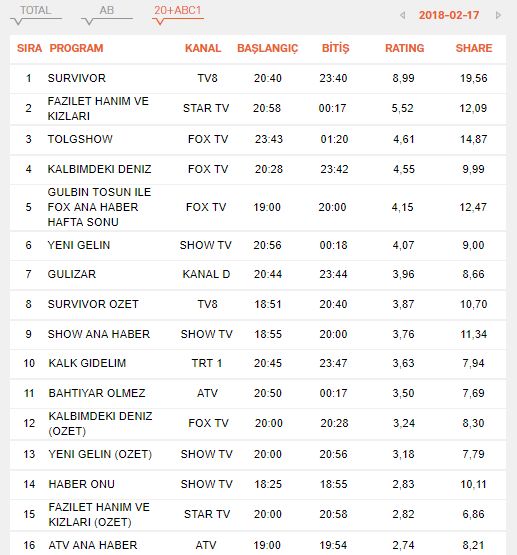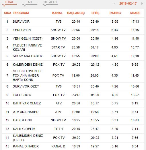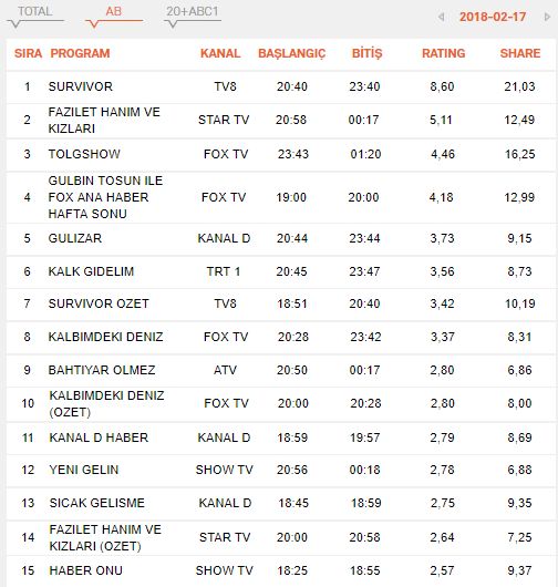 17 Şubat 2018 Cumartesi Reyting Sonuçları