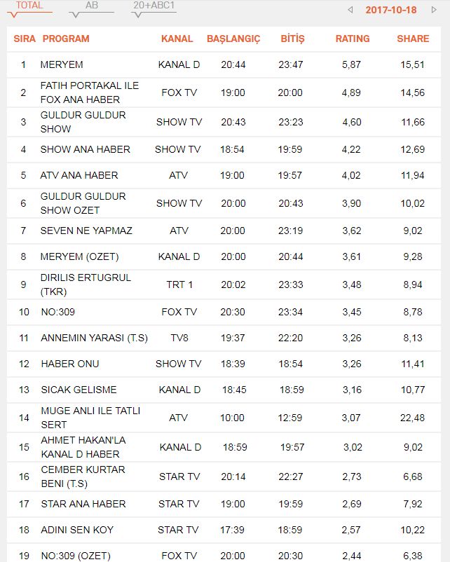 18 Ekim 2017 Çarşamba Reyting Sonuçları-Meryem mi Güldür Güldür Show mu?