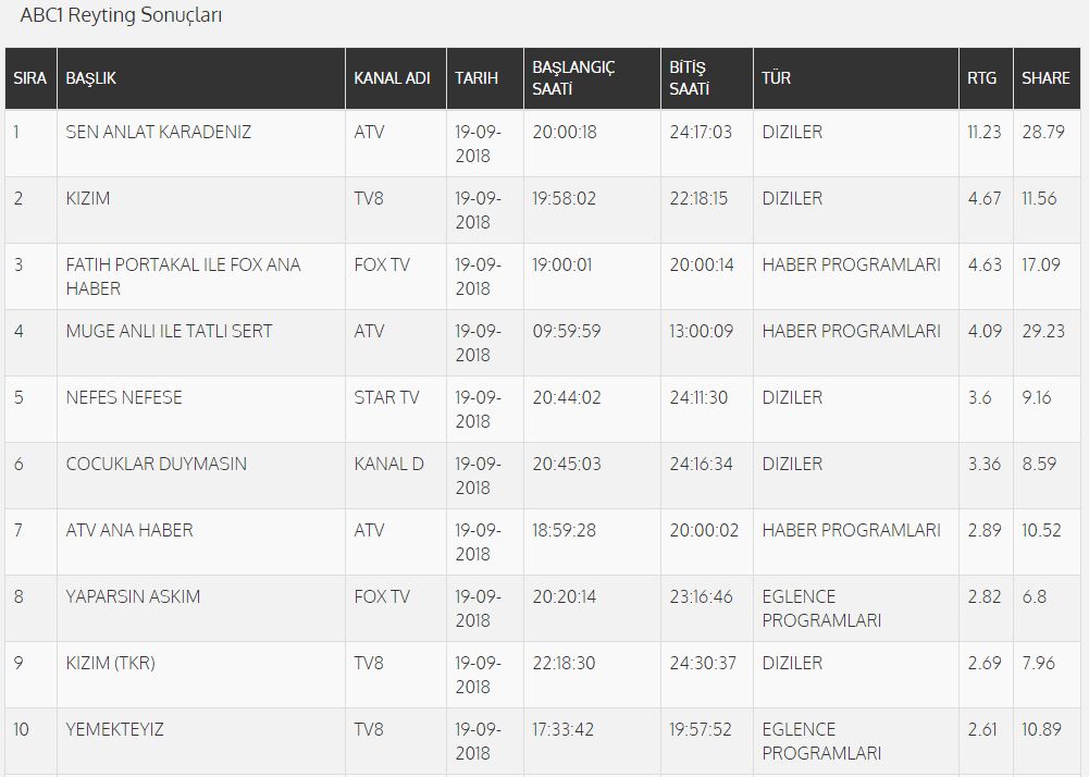 19 Eylül 2018 çarşamba reyting sonuçları 20 Eylül perşembe günü saat 10.00 itibari ile açıklanacaktır.