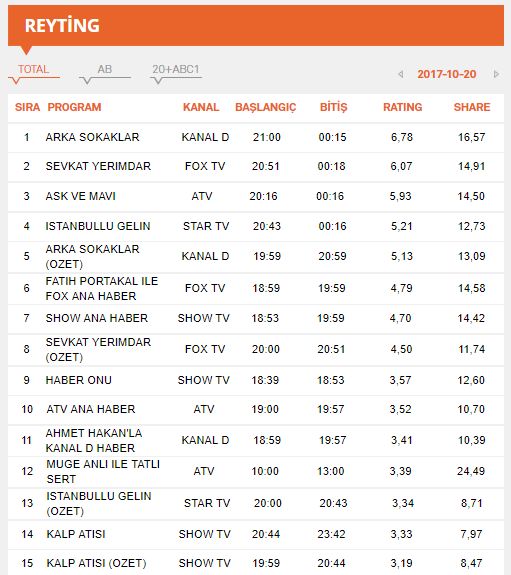 | 8 | ARKA SOKAKLAR | KANAL D | 13-10-2017 | 20:44:55 | 24:14:49 | DIZILER | 3.97 | 9.56 |