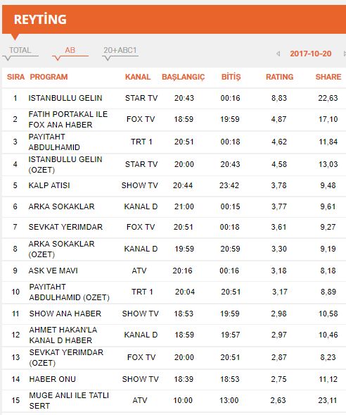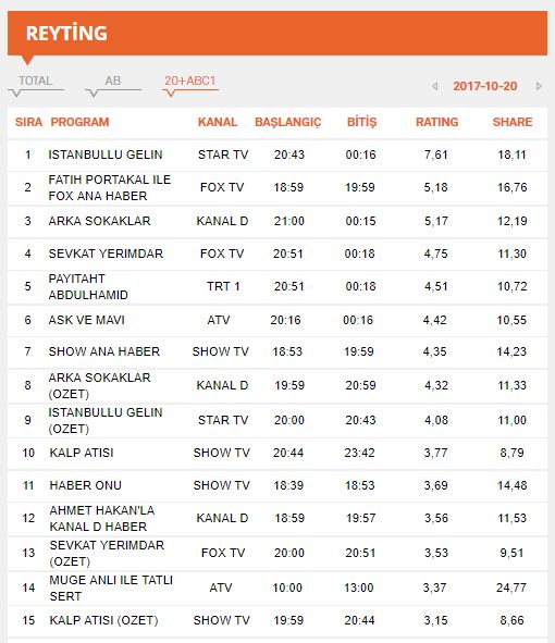 | 1 | ISTANBULLU GELIN | STAR TV | 13-10-2017 | 20:58:50 | 24:17:12 | DIZILER | 6.76 | 16.29 |