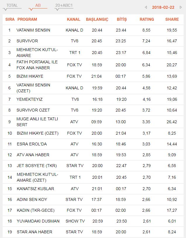 22 Şubat 2018 Perşembe reyting sonuçlarında etki edecek 3 yapım bu akşam kozlarını paylaşacak. Bunlardan birisi yarışma formatında ekranlara gelen Survivor diğer Bizim hikaye ve son olarak Vatanım Sensin. 22 Şubat Perşembe günü ekranlara gelecek olan diğer yapımlar ise şunlar; Kanatsız Kuşlar, Mehmetçik Kutül Amare ve Yuvamdaki Düşman. 22 Şubat 2018 Perşembe reyting sonuçları açıklandı mı? İşte detaylar.