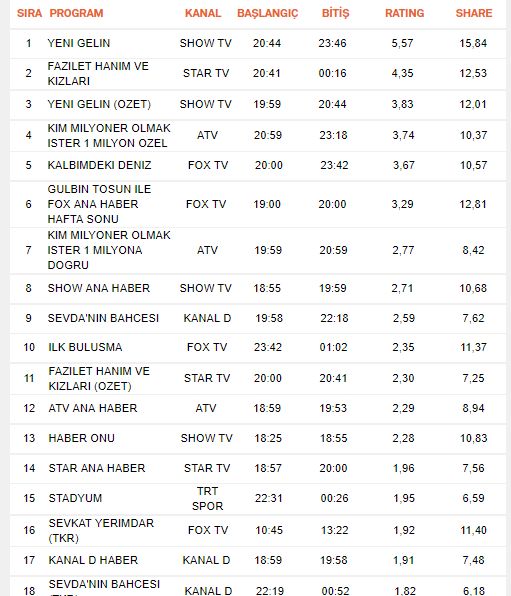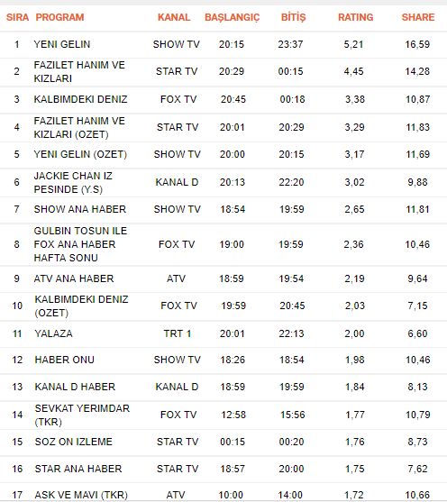 İsterseniz günün reyting sonuçları ve analizlerine geçmeden önce geçtiğimiz hafta nasıl bir tablo izlemişiz bir inceleyelim. Aşağıdaki tablodan da görüleceği gibi Yeni Gelin yeni sezona hızlı başlamış. Fazilet Hanım ve Kalbimdeki Deniz dizilerinin rekabeti sürüyor. Ardaki yaklaşık 1 puanlık fark kapanabilecek bir fark. 23 Eylül 2017 cumartesi reyting sonuçları öncesinde Yalaza’nın durumu hiçte iç acıcı değil. Yalaza dizisi 2,00lık reyting oranı ile kötü bir başlangıç yapmıştı. Hikayesi ilginç olmakla beraber ilk bölüm itibari ile pek fazla izlenmedi. Tabi tekrarları ile izleyiciye kendisini alıştırdıysa bugün oranını arttırabilir.