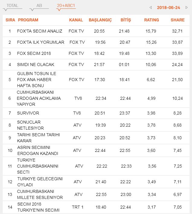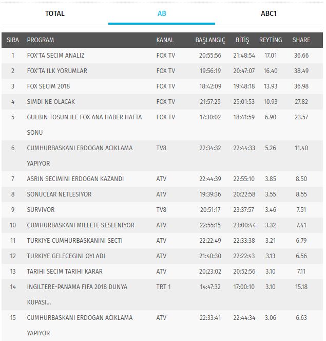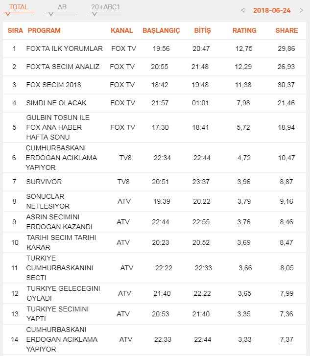 Seçim Sonuçlarını an ve an ekranlara getiren Fox Tv, Atv, Star ve diğer kanallardan hangisi daha çok izlendi. Reyting Sonuçlarında hangi kanal zirveye oturdu. Sonuçlar açıklandığında haberimize eklenecektir. Reyting sonuçlarına damga vuran kanal Fox Tv oldu. Fox her üç kategoride de ilk 3 sırayı kimselere kaptırmadı.