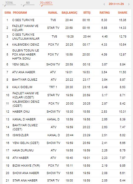 | 7 | O SES TURKIYE | TV8 | 18-11-2017 | 4.23 | 10.11 |