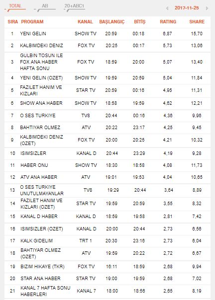| 1 | YENI GELIN | SHOW TV | 18-11-2017 | 6.61 | 15.79 |