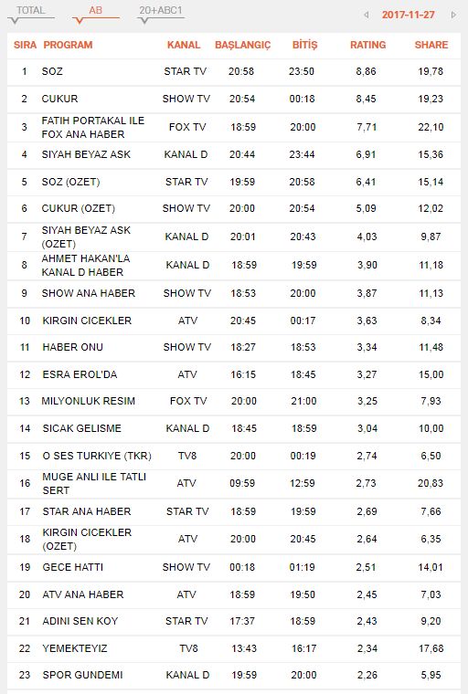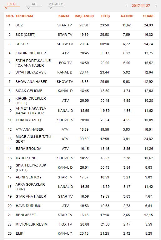 | 1 | SOZ | STAR TV | 11.14 | 25.43 |