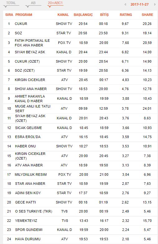 | 7 | CUKUR (OZET) | SHOW TV | 4.95 | 11.17 |