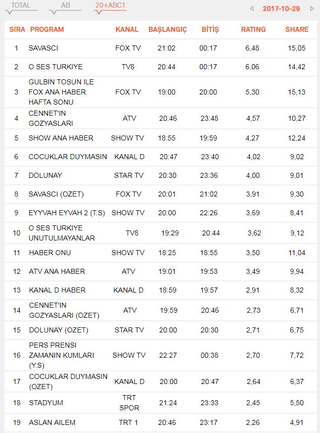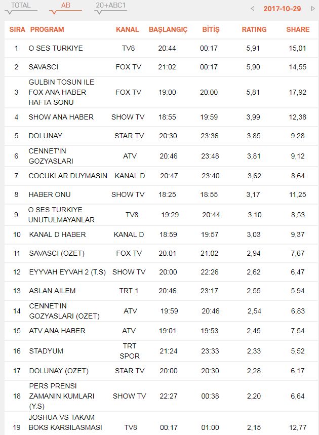 29 Ekim Pazar Reyting sonuçları ve analizleri. 29 Ekim Pazar günü ekranlarda yer alacak dizi ve programların Reyting sonuçları ve Analizleri haberimizde… 29 Ekim 2017 Pazar günü ekrana gelecek bazı dizi ve programlar; Savaşçı, O Ses Türkiye, Aslan Ailem, Cennetin Gözyaşları ve Çocuklar Duymasın…