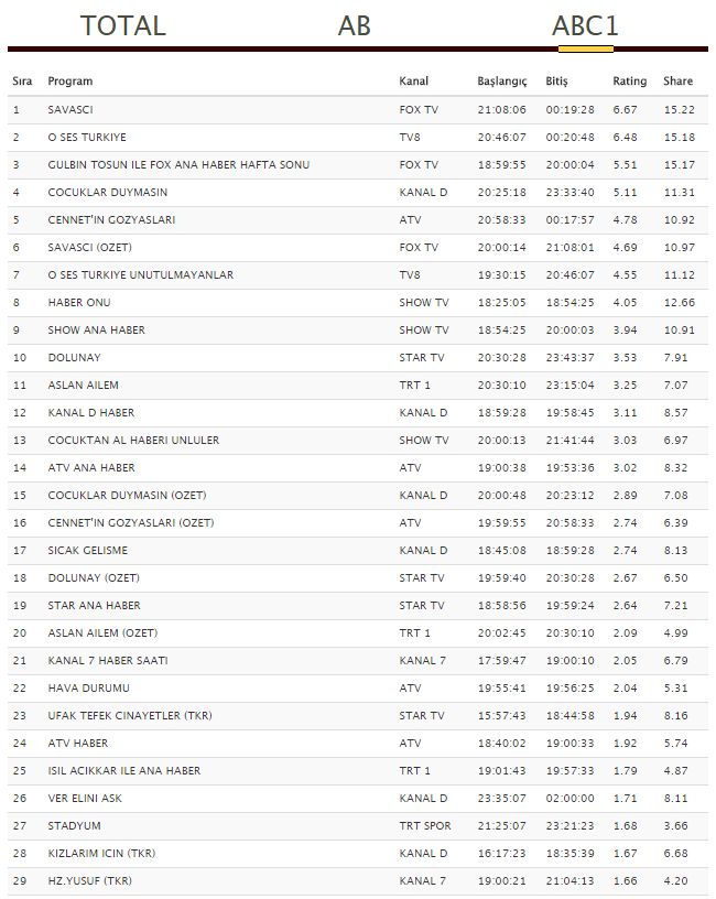 | 13 | KANAL D HABER | KANAL D | 26-11-2017 | 3.15 | 7.85 |