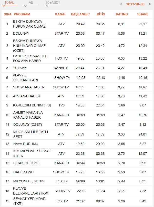 Geçtiğimiz hafta futbol müsabakası olduğu için Eşkıya Dünyaya Hükümdar Olmaz 8.3 reyting ile 2. sırada yer alıyordu. En yakın rakibi Dolunay ise 4.49 reyting ile 5. sırada yer almıştı.