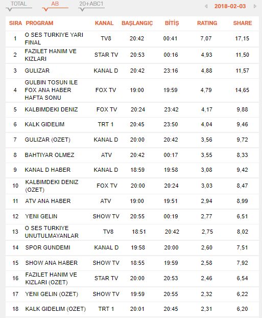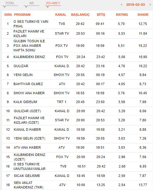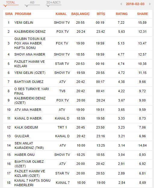 3 Şubat 2018 Cumartesi Reyting Sonuçları ve Analizlerihaberimizle sizlerleyiz. 3 Şubat 2018 Cumartesi Reyting Sonuçları- Yeni Gelin Mi, Kalbimdeki Deniz Mi? haberimizi sizler için derledik. 3 Şubat 2018 günü ekranlarımıza gelecek diziler; Yeni Gelin, Kalk Gidelim, Kalbimdeki Deniz, Gülizar, Bahtiyar Ölmez, Fazilet Hanım ve Kızları. 3 Şubat2018 Cumartesi Reyting Sonuçları