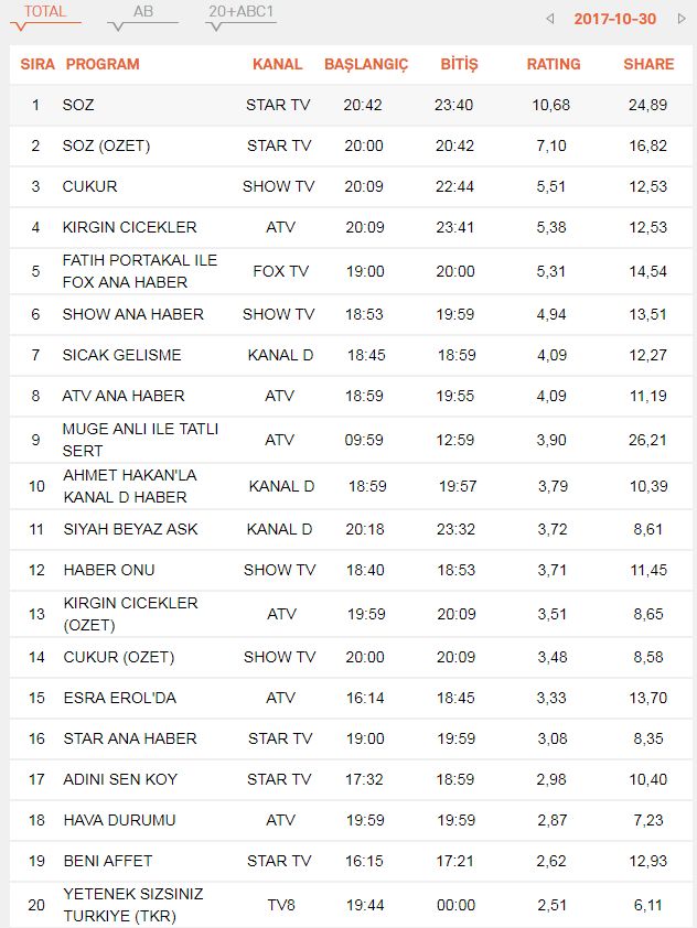 GÜNLÜK REYTİNG SONUÇLARI<<<Tıkla