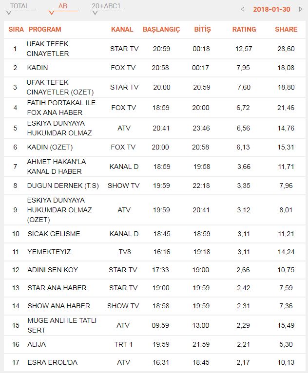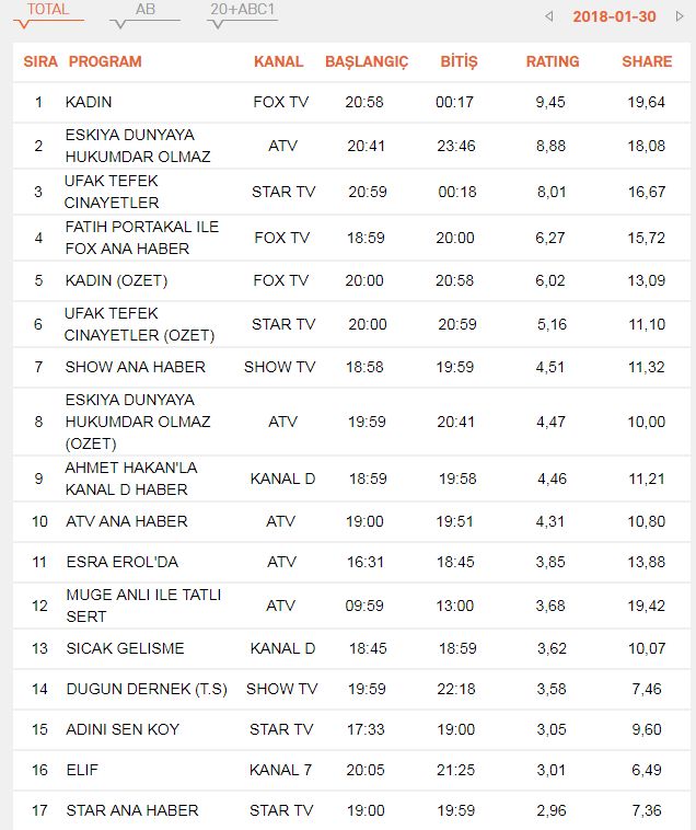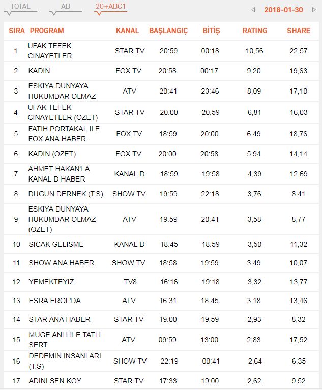 30 Ocak 2018 Salı Reyting Sonuçları haberimiz reyting sonuçları açıklandığında güncellenecektir. Siz de sevdiğiniz bu önemli yapımlar hakkındaki görüşleriniz yorum yaparak bizlere iletebilirsiniz. 23 Ocak 2018 Salı Reyting Sonuçları- Ufak Tefek Cinayetler Mi, Edho Mu?