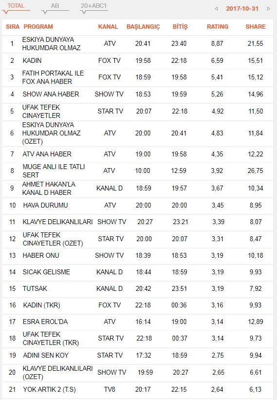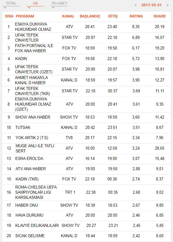 31 Ekim 2017 Salı günü reyting sonuçlarını, analizlerini ve daha fazlasını sitemizden takip edebilirsiniz…