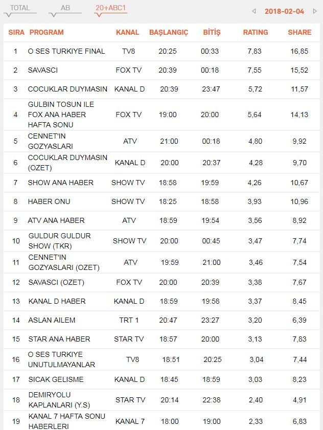 | 6 | SHOW ANA HABER | 28-01-2018 | 20:00:01 | 4.8 | 11.68 |