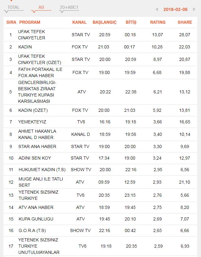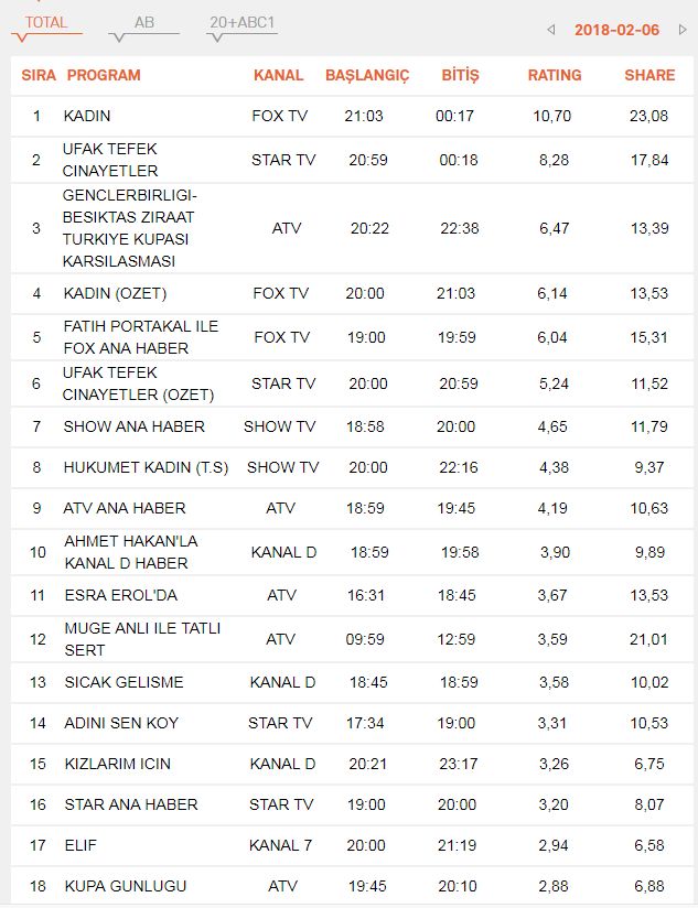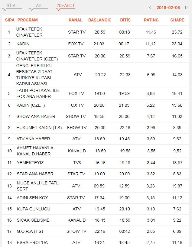 6 Şubat 2018 Salı Reyting Sonuçları