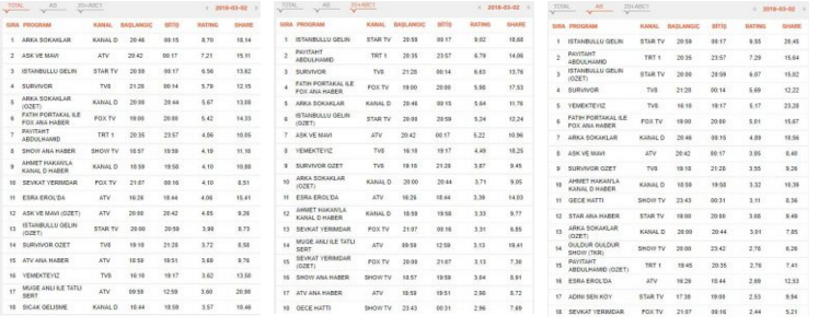 Güçlü rakiplerin reyting savaşı verdiği 9 mart cuma zirvenin sahibi kim oldu? Aşk ve Mavi, İstanbullu Gelin, Şevkat Yerimdar, Arka Sokaklar Payitaht Abdülhamid ve Survivor arasında 9 mart 2018 cuma izleyici tarafından hangi dizi veya yarışma tercih edildi?