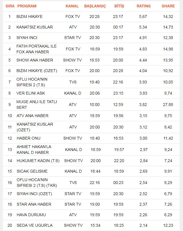 Tıkla>>>GÜNLÜK REYTİNG SONUÇLARI<<<Tıkla