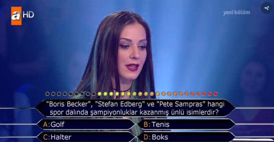 Bu akşamki bir diğer yarışmacı tasarımcı. Genç bir bayan. 1 yıl ingilizce eğitim alan Burcu Hanım’ın sorusu çok merak uyandırdı.Seneye eğitimine Amerika’da devam etmek isteyen Burcu Hanım, birçok sporla da yakından ilgileniyor. Soru Boris Becker Stefan Edberg Pete Sampras hangi spor dalında şampiyonluk kazanmışlardır?