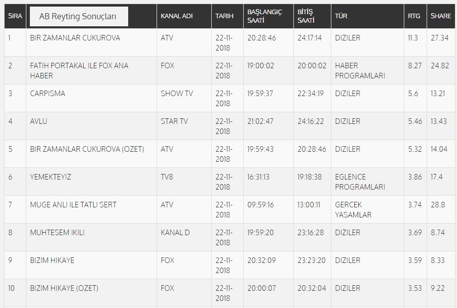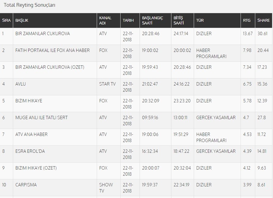 Çarpışma, Perşembe günü; Bir Zamanlar Çukurova – ATV, Bizim Hikaye – FOX, Avlu – STAR, Muhteşem İkili – KANALD, dizileri ile yarıştı. Dizilerin yayında oldukları saatlerde TRT1 de Kurtlar Vadisi Vatan ve TV8’de Çakallarla Dans 2 filmleri de yayınlandı. Peki reytingler nasıl dağıldı? Kim kazandı? Reyting savaşlarında Perşembe gününü kim zirvede tamamladı?