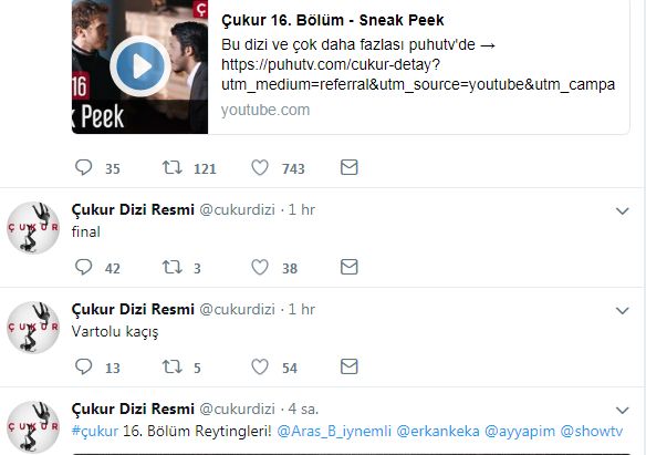 Geçtiğimiz Pazartesi günü mükemmel bir bölüm ile ekranlara gelen Çukur dizisinde hem reytinglerde hem de sosyal medyada oldukça yüksek reytingler aldı. Öyleki Çukur ve Söz arasında Total kategorisindeki fark virgüllere kadar indi. AB ve ABC kategorilerinde birinciliği vermeyen Çukur, Totalde de aradaki farkı en aza indirerek, 0,22 fark ile ikinci sıradaki yerini korudu. Ancak Söz için tehlike çanlarının sesi gelmeye başladı. Her şey Çukur için güzel giderken bir gelişme sosyal medyada şok etkisi yaptı. Dizinin Resmi Twitter Hesabından final paylaşımı yapıldı.