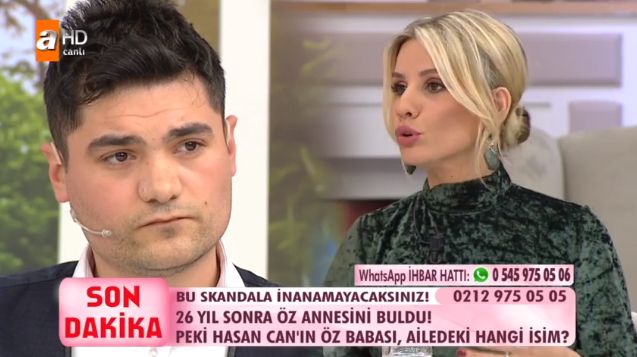 Dün canlı yayına telefonla bağlanan biyolojik anne, “13-14 yaşlarında, kendime sahip çıkamadım, sana nasıl sahip çıkayım. Sana kapım her zaman açık ama ben lenf kanseriyim. Psikolojim bozuk benim. Babam seni çöpe atmadı. Hastayım gelemem.” demiş ve Hasancan’ın gerçek babasının aileden birisi olduğu ortaya çıkmıştır. Hasan Can’ın gerçek babası aynı zamanda öz dayısı olan Mevlüt Eke çıkmıştır.