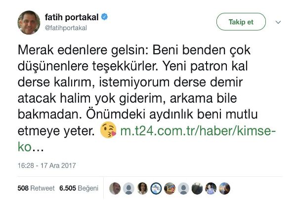 Fatih Portakal’ın sosyal medyada yaptığı açıklamada “…istemiyorum derse demir atacak halim yok giderim,arkama bile bakmadan…” ifadesindeki sitemkar sözler iddiaların sanki doğru olduğu yönünde yorumlandı. Tabi herşeyden önce bunların bir iddia olduğunun altını çizmekte yarar var. Bakalım zaman bize ne gösterecek. Ayrıca şunları söylemekte yarar var;