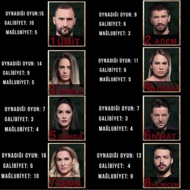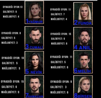 Cumali yaptığı konuşmalar, çıkışlar ve duygu sömürüsüyle kendine bir kitle edinmeyi başardı. Onun daha uzun süre eleneceğini düşünmüyoruz. Ramazan; adanın hem sevilen hemde başarılı isimlerinden biri. Zaten Yağmur Ramazan’ın ismini verirken gitme ihtimali olmadığı için onu söylediğini açıklamıştı. Bizde Yamur’a katılıyoruz. Ramazan da eleme potasından çıkacak isimlerden. Bizim düşüncemiz adaya 2. haftada veda edecek isim Gizem oldu. Bugüne kadar yatığımız tahmin ve analizleri %90 tutturduğumuzu göz önüne alırsak Gizem adaya veda eden isim olacak.